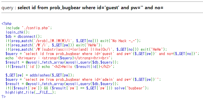 pw는 '를 필터링하고 있고, no에는 ' 와 substr, ascii, =, or, and, 공백, like, 0x 등을 필터링하고 있다.
