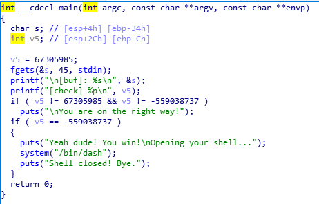 만약 v5 가 -559038737 이면 /bin/dash를 준단다.