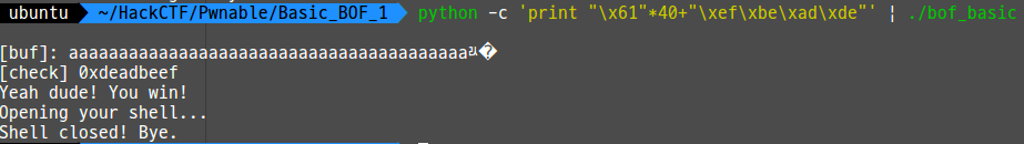 0x28을 10진수로 바꿔서 40 뒤에 deadbeef를 줬더니 이겼다고 뜬다.