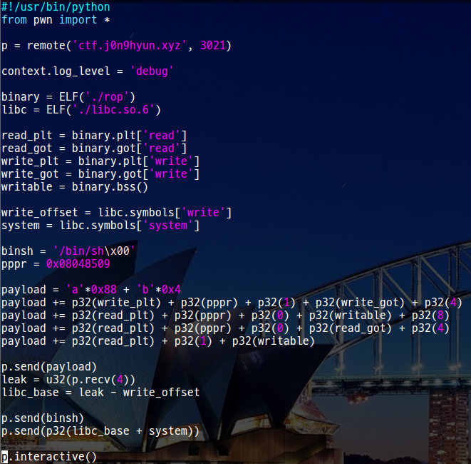 write를 릭해서 libc_base를 구하고 /bin/sh를 넣고 libc_base 주소와 system 주소를 더해서 쉘을 따면 될 것 같다.