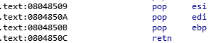 write는 인자가 3개이므로 먼저 pop, pop, pop, ret 가젯을 찾았다.
